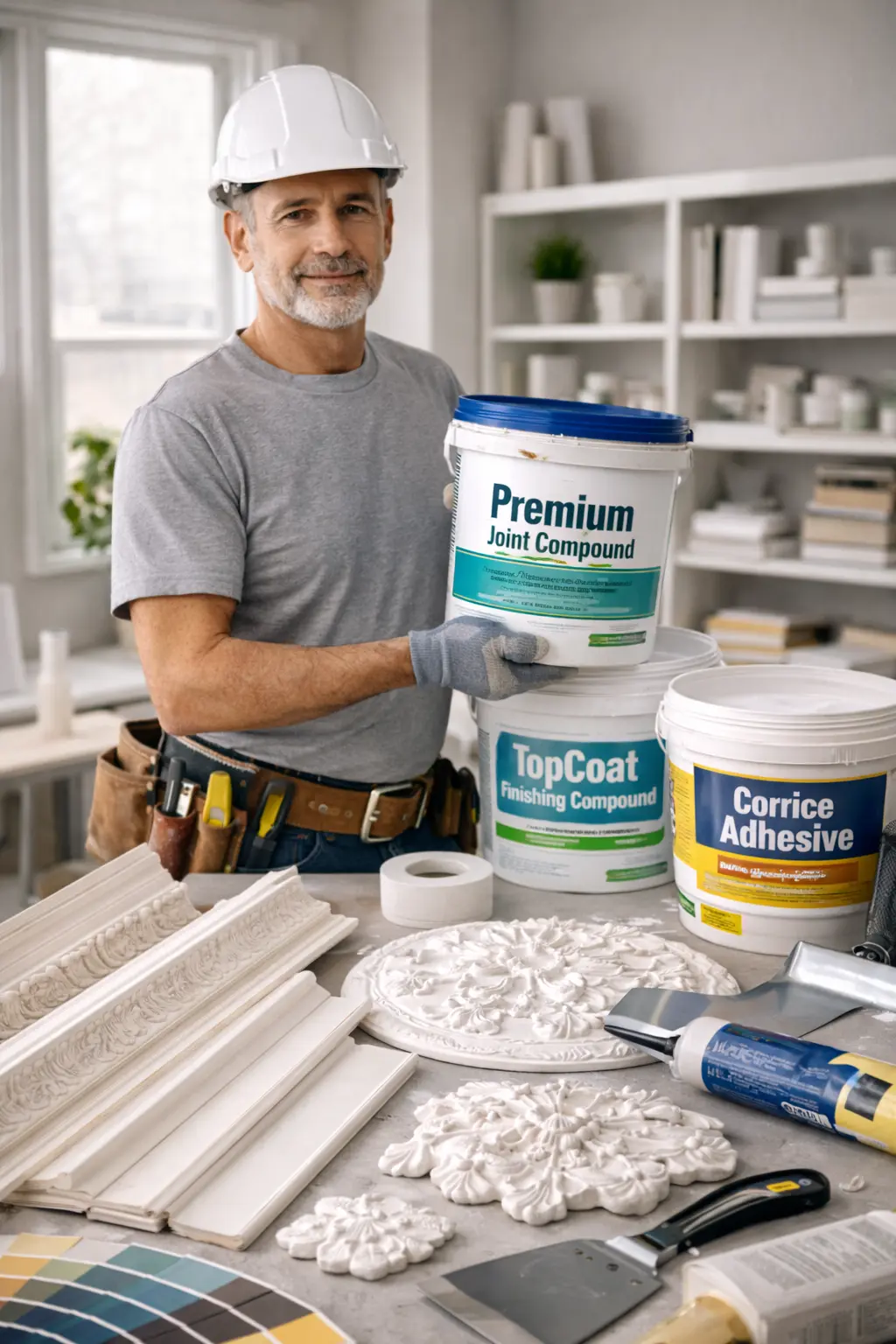 Compounds & Adhesives: Including base coat, top coat, cornice cement, and stud adhesive from trusted names like CSR and Knauf.